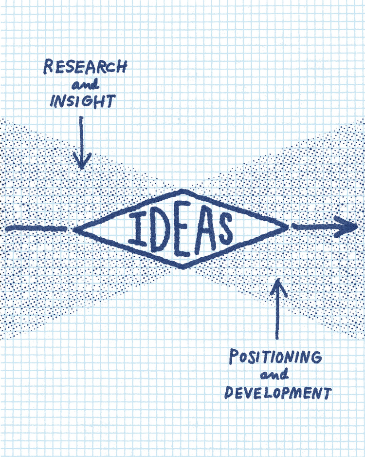Giving form to emerging visions and strategiesIdeas are the cornerstone of innovation. Flanked by research and insight on one side and strategic positioning and development on the other, everything hinges on having a great idea.